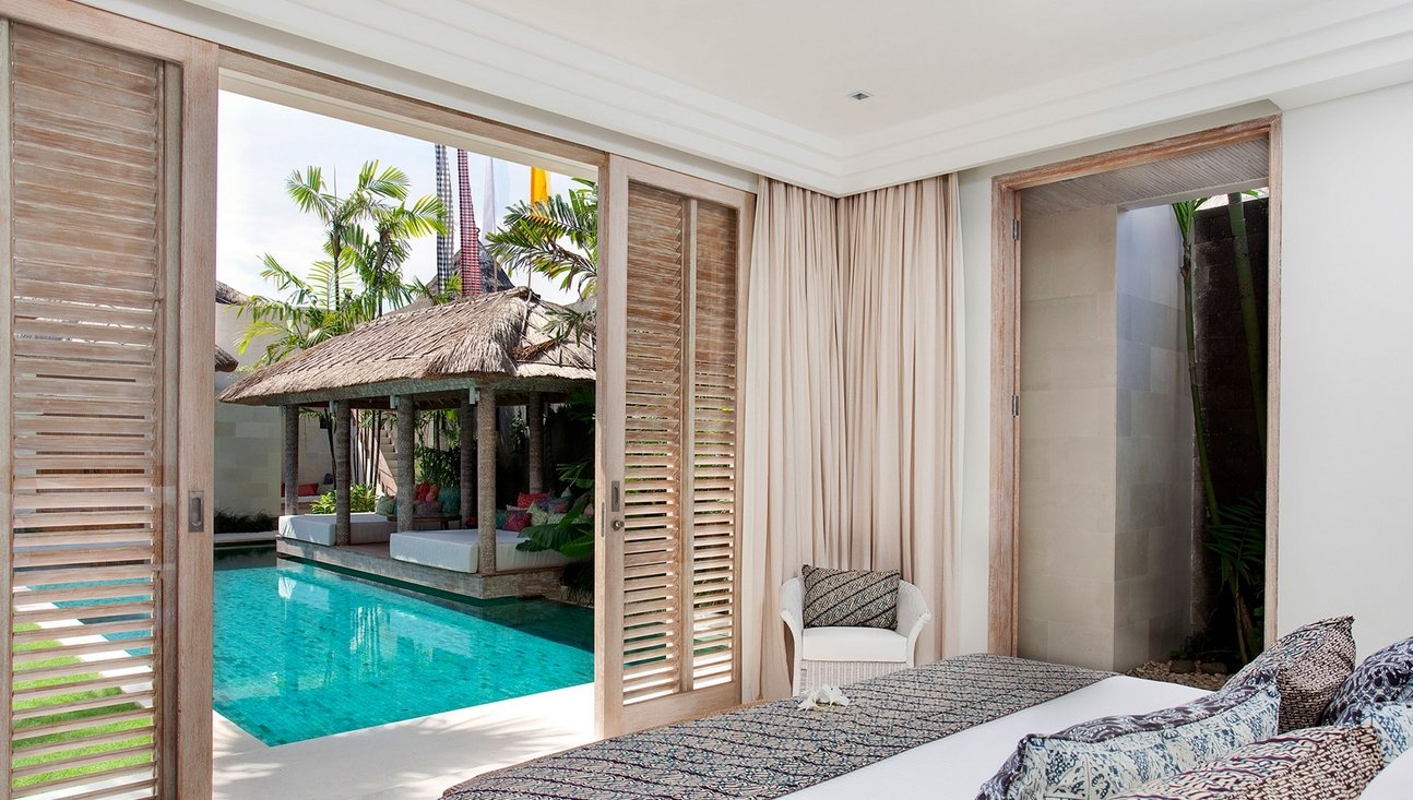 Set amongst lush tropical gardens, the three bedroom the villa is a haven for lounging and relaxation. Suspended above the 14-metre green-stone-tiled swimming pool, a traditional bale provides the perfect spot to while away the day.