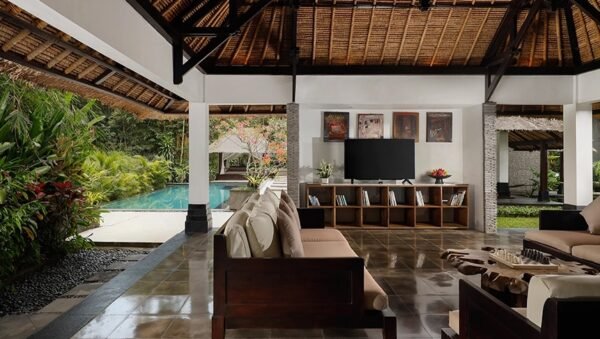 Nestled within the lush embrace of a jungle-clad river gorge near the serene village of Kaba-kaba in Bali’s Tabanan Regency, this riverside suite offers a sanctuary for the soul. Blending traditional thatched-roofed pavilions with the beauty of towering bamboo and the Penet River, the property emerges as a retreat deeply rooted in nature.