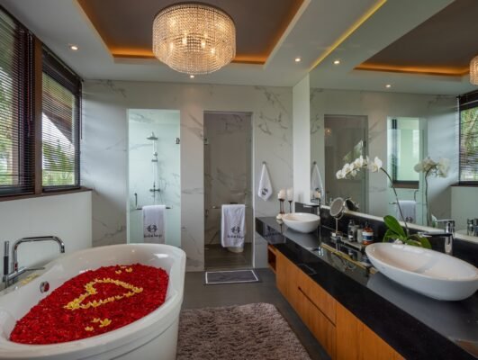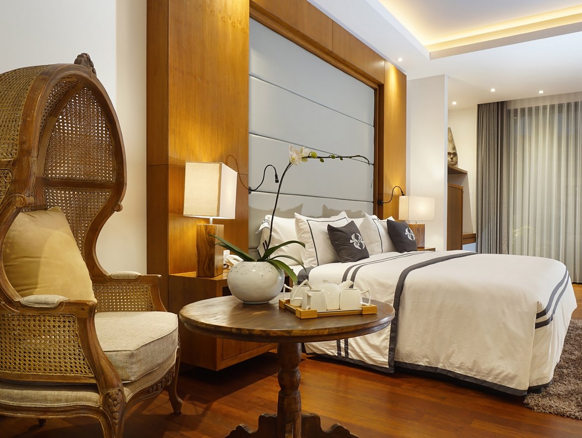 Four Deluxe Suites: Ground-floor king-size bedrooms with private lounges, indoor/outdoor marble-tiled bathrooms, and pool views. Each suite has a veranda with teak daybeds and dining tables.