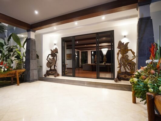 Shaded teak daybeds line the verandas, while the 32-metre infinity pool is framed by palm trees, frangipani, and Balinese statues. A poolside balé and hidden garden alcove provide tranquil spots to relax. Sun loungers and umbrellas allow for endless poolside enjoyment.