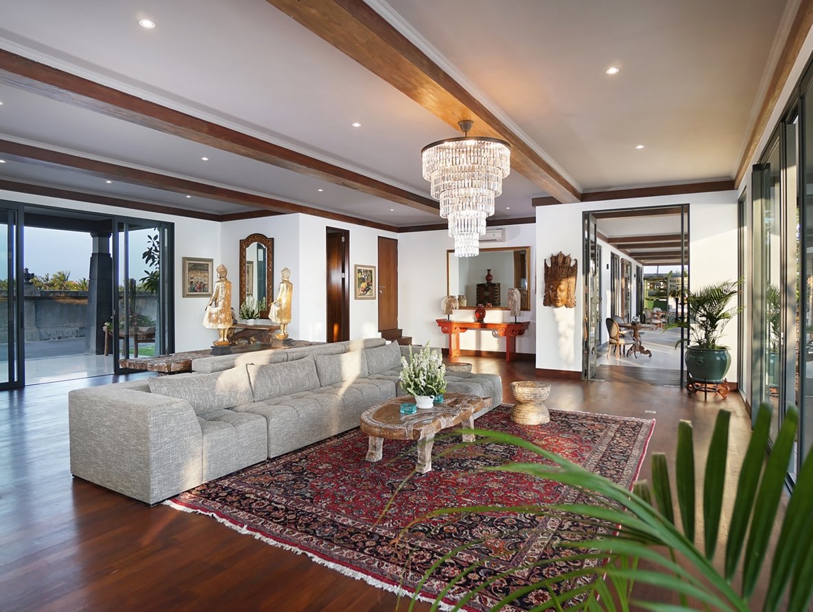 Step into the air-conditioned lounge, where shades of blue reflect the infinity pool and ocean beyond. Relax on an extra-long sofa surrounded by antique Torajan carvings and masks. The kitchen, dining, and lounge pavilion features glass bi-fold doors for seamless indoor-outdoor living, a fully equipped kitchen with marble counters, a wine fridge, and a dining table for ten. Sofa and beanbag seating offer the perfect vantage for ocean views.
