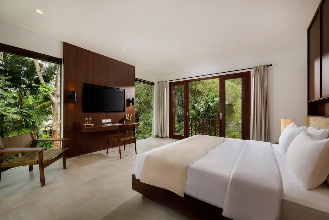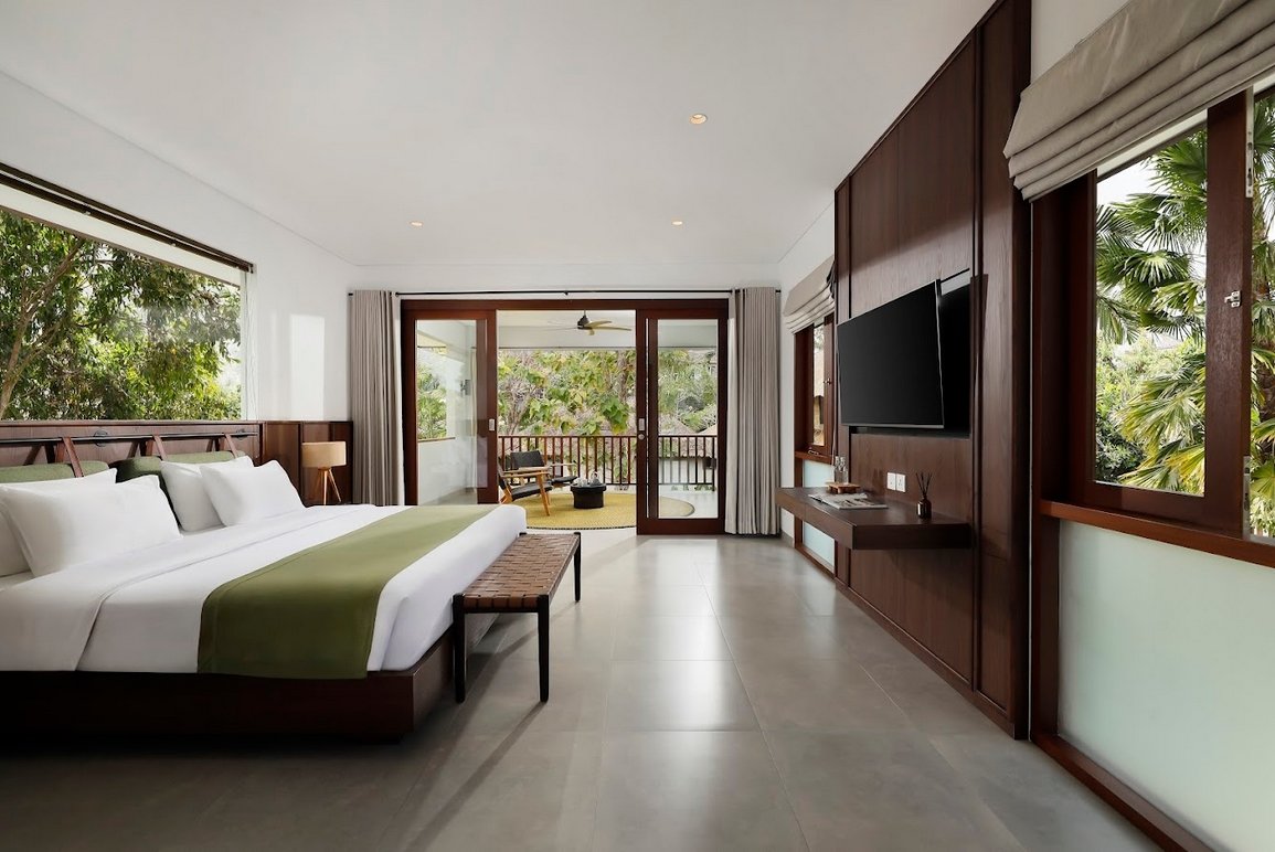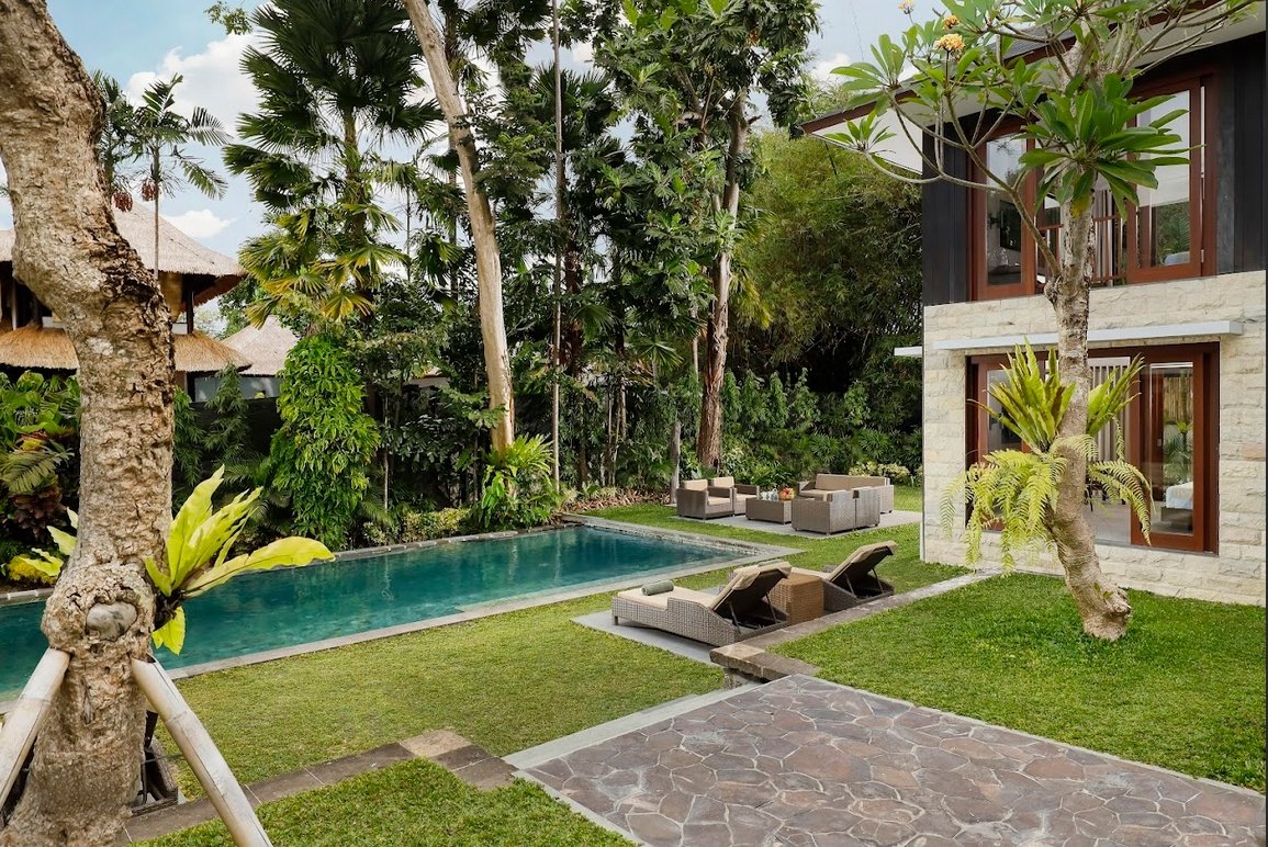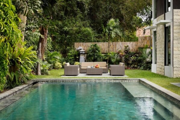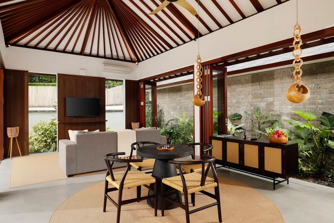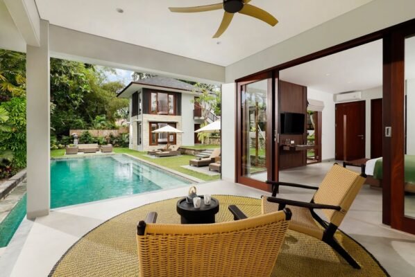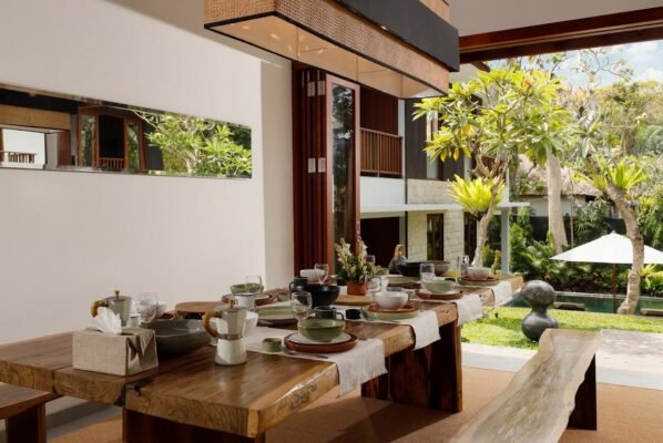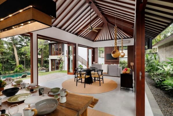 The villa’s design captures the essence of Bali’s tropical allure, blending indoor and outdoor living.