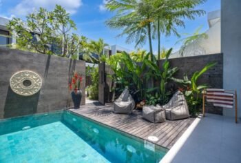 Modern minimalist architecture highlights the textures of natural materials such as teakwood panels and Paras Kerobokan sandstone, creating a warm yet sophisticated ambiance. The villa opens into a private courtyard garden featuring a 4m plunge pool, timber deck, and weatherproof beanbags — your personal slice of tropical bliss.